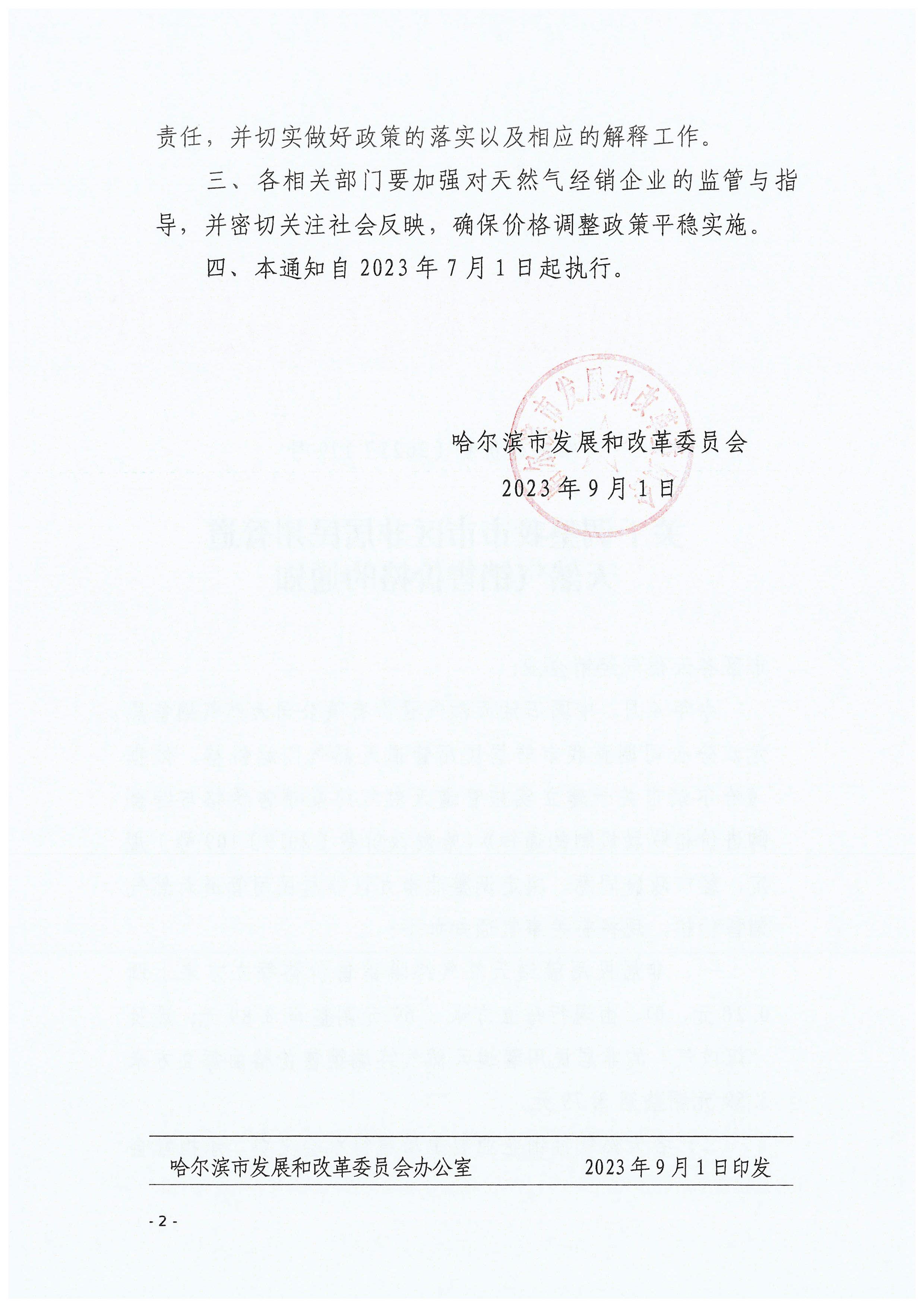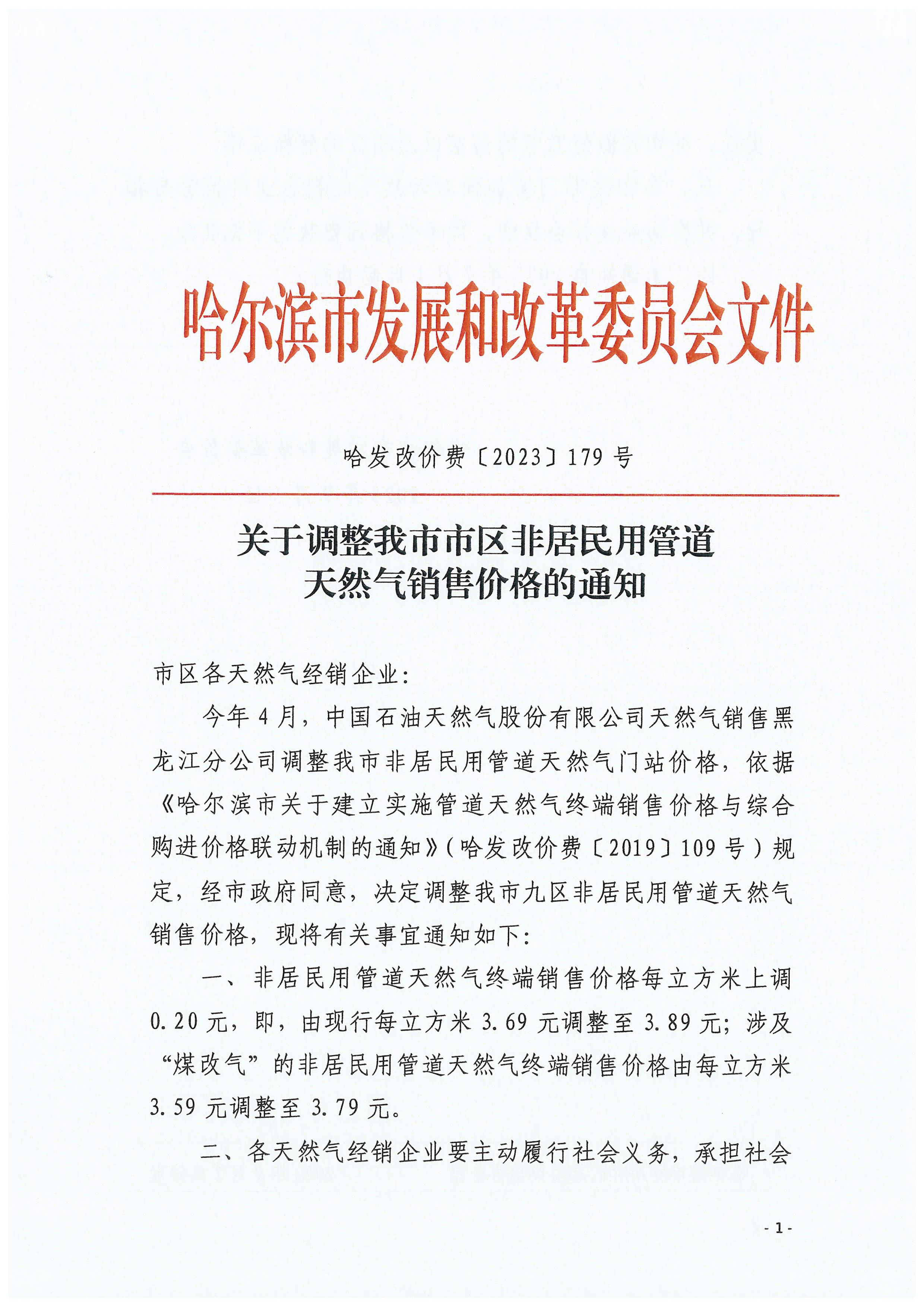 《關(guān)于調(diào)整我市市區(qū)非居民用管道天然氣銷(xiāo)售價(jià)格的通知》(哈發(fā)改價(jià)費(fèi)〔2023〕179號(hào))