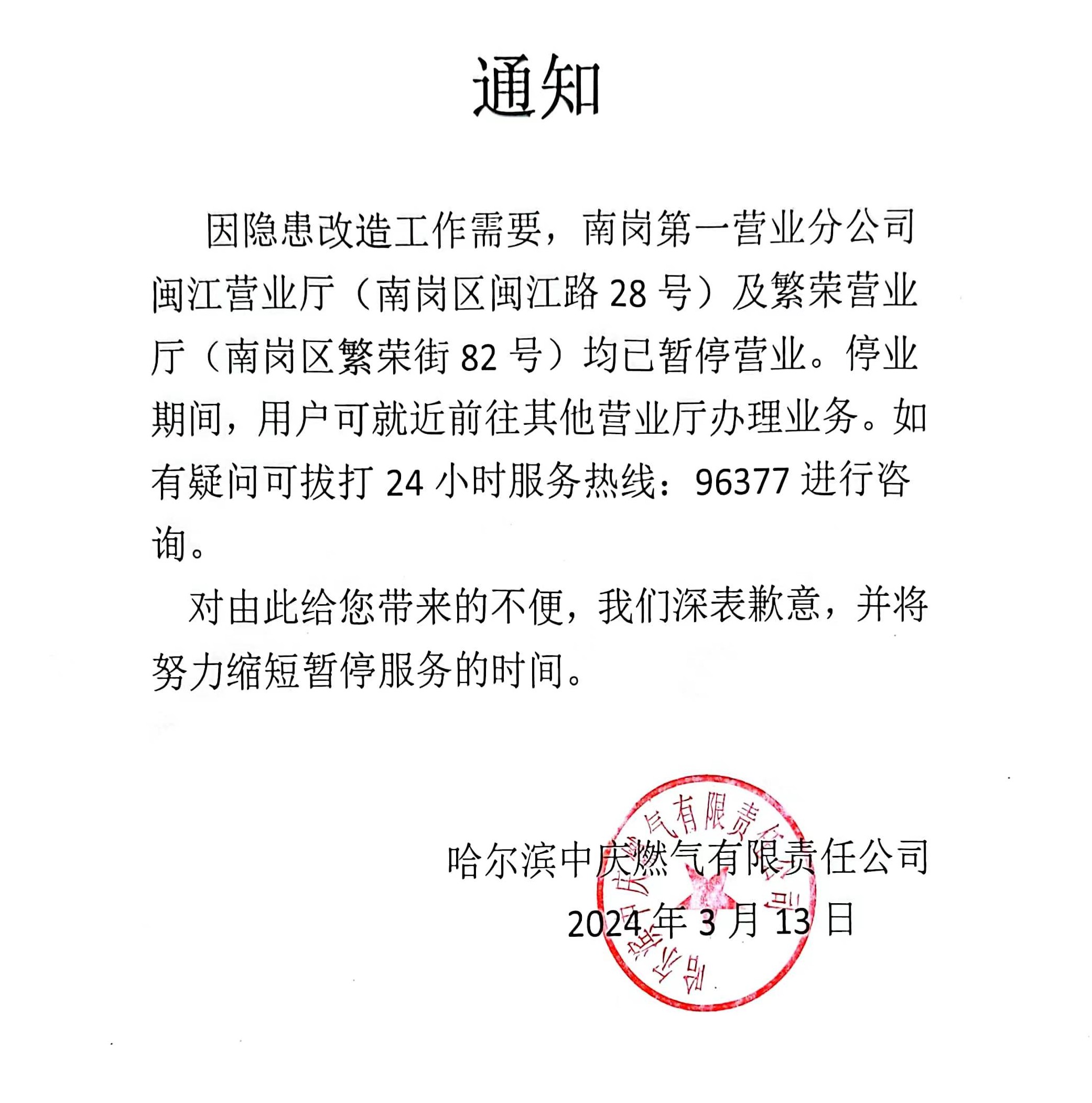 南崗第一營業(yè)廳繁榮廳及閩江廳暫停營業(yè)通知