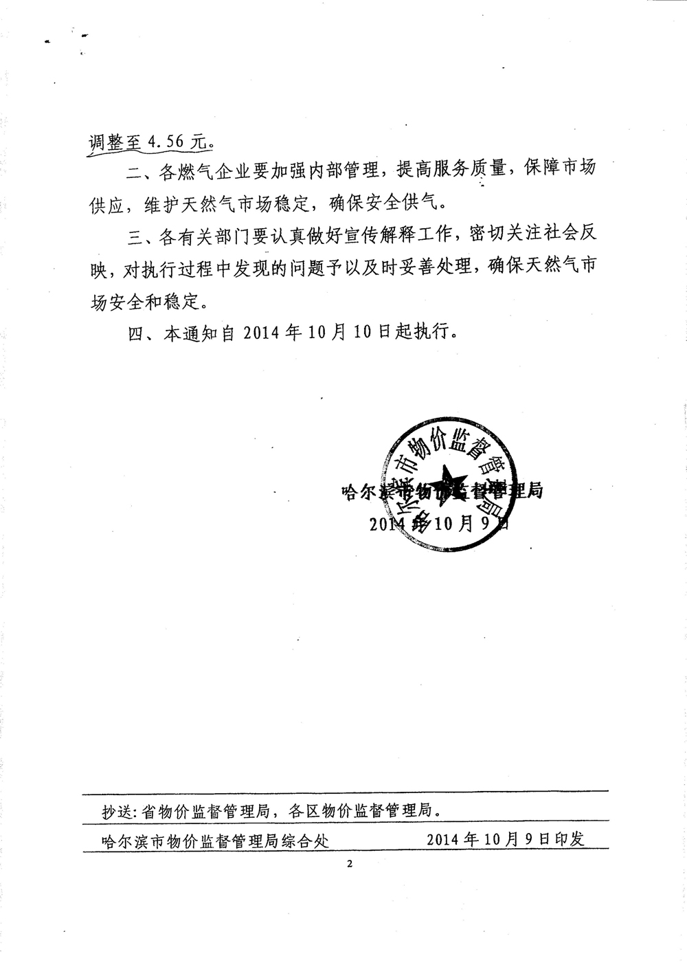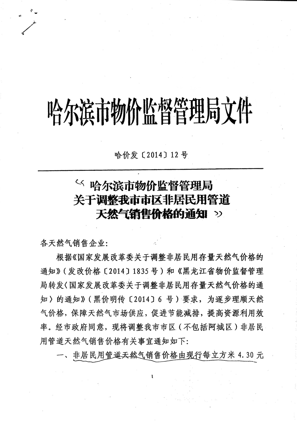 哈爾濱市物價監(jiān)督管理局關(guān)于調(diào)整我市市區(qū)非居民用管道天然氣銷售價格的通知