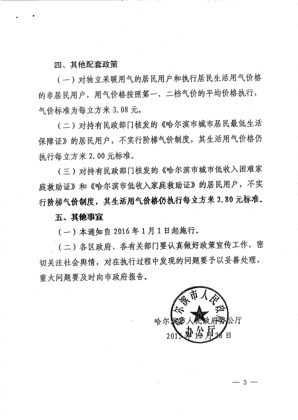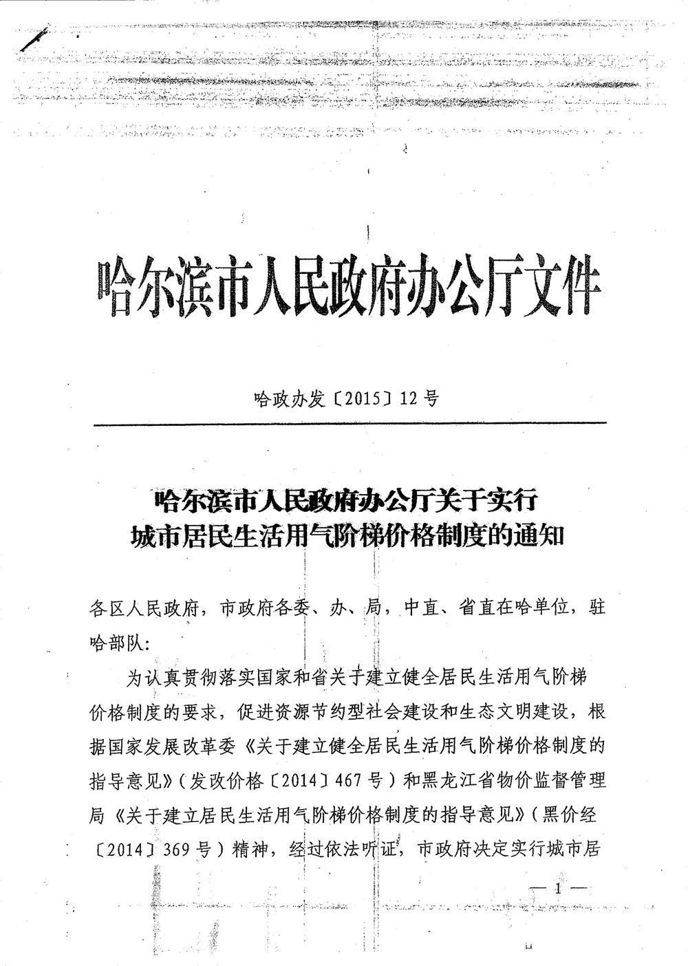 哈爾濱市人民政府辦公廳關(guān)于實行城市居民生活用氣階梯價格制度的通知