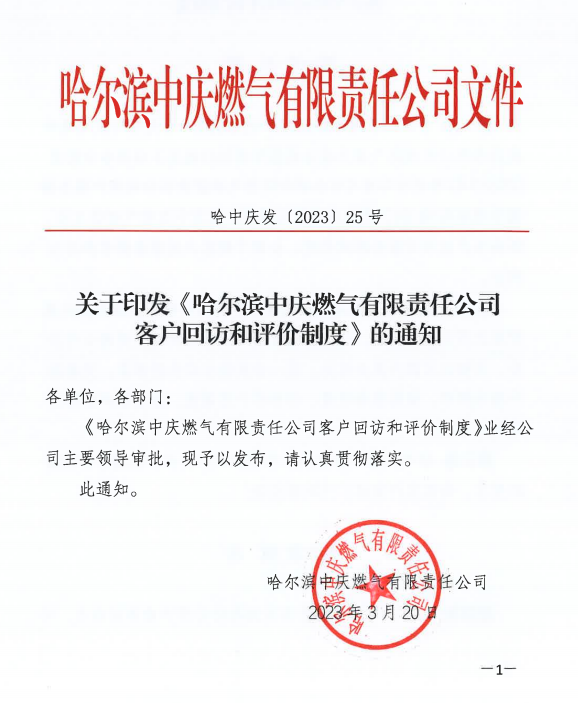 哈中慶發(fā)〔2023〕25號(hào) 關(guān)于印發(fā)《哈爾濱中慶燃?xì)庥邢挢?zé)任公司客戶(hù)回訪和評(píng)價(jià)制度》的通知