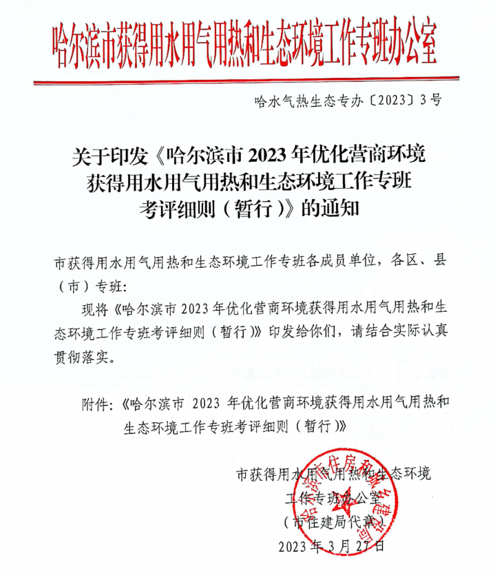關(guān)于印發(fā)《哈爾濱市2023年優(yōu)化營商環(huán)境專項行動提升獲得用水用氣用熱服務(wù)質(zhì)效實施方案》、《哈爾濱市2023年優(yōu)化營商環(huán)境專項行動提升藍天碧水凈土森林覆蓋指數(shù)實施