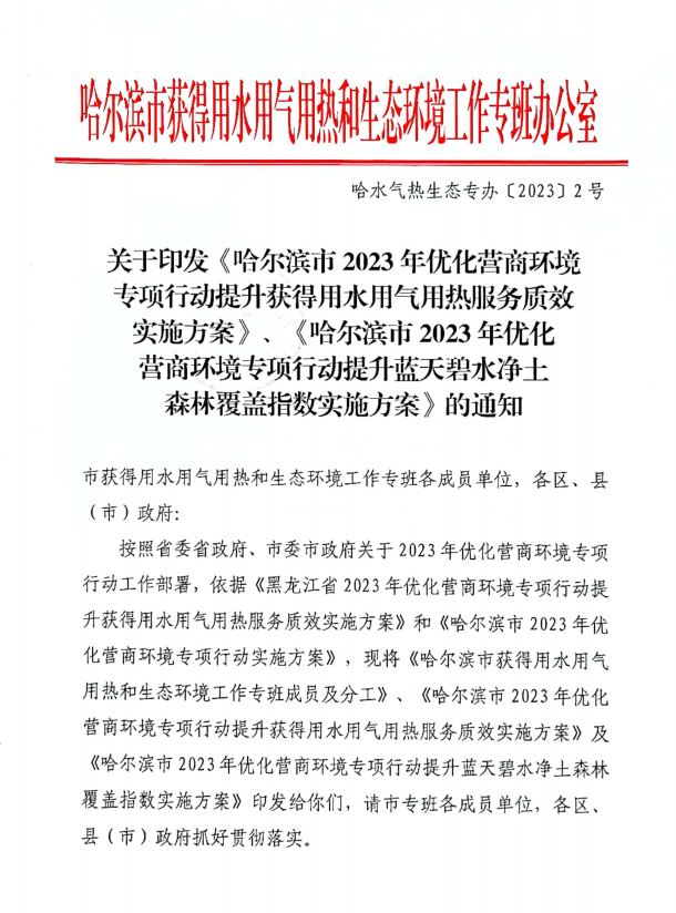 關(guān)于印發(fā)《哈爾濱市2023年優(yōu)化營商環(huán)境專項行動提升獲得用水用氣用熱服務(wù)質(zhì)效實施方案》、《哈爾濱市2023年優(yōu)化營商環(huán)境專項行動提升藍天碧水凈土森林覆蓋指數(shù)實施