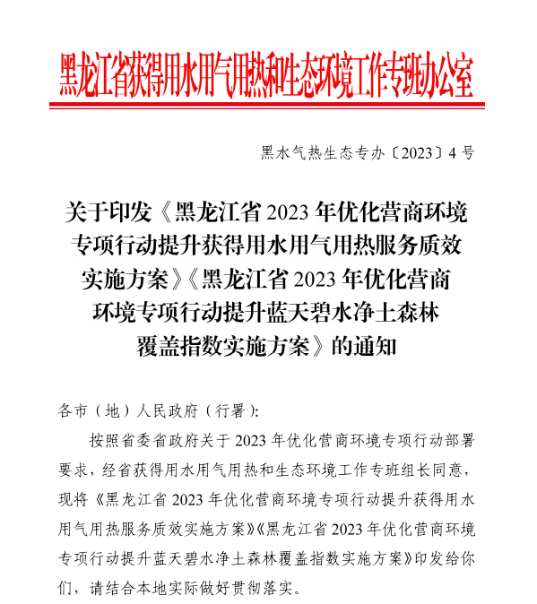 關(guān)于印發(fā)《黑龍江省2023年優(yōu)化營商環(huán)境專項(xiàng)行動(dòng)提升獲得用水用氣用熱服務(wù)質(zhì)效實(shí)施方案》《黑龍江省2023年優(yōu)化營商環(huán)境專項(xiàng)行動(dòng)提升藍(lán)天碧水凈土森林覆蓋指數(shù)實(shí)施方