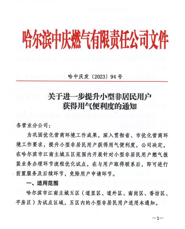 哈中慶發(fā)〔2023〕94號 關于進一步提升小型非居民用戶獲得用氣便利度的通知